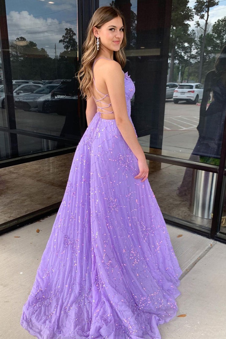V Neck Lilac Tulle A-Line Long Prom Dress with Sequin ,PD230836