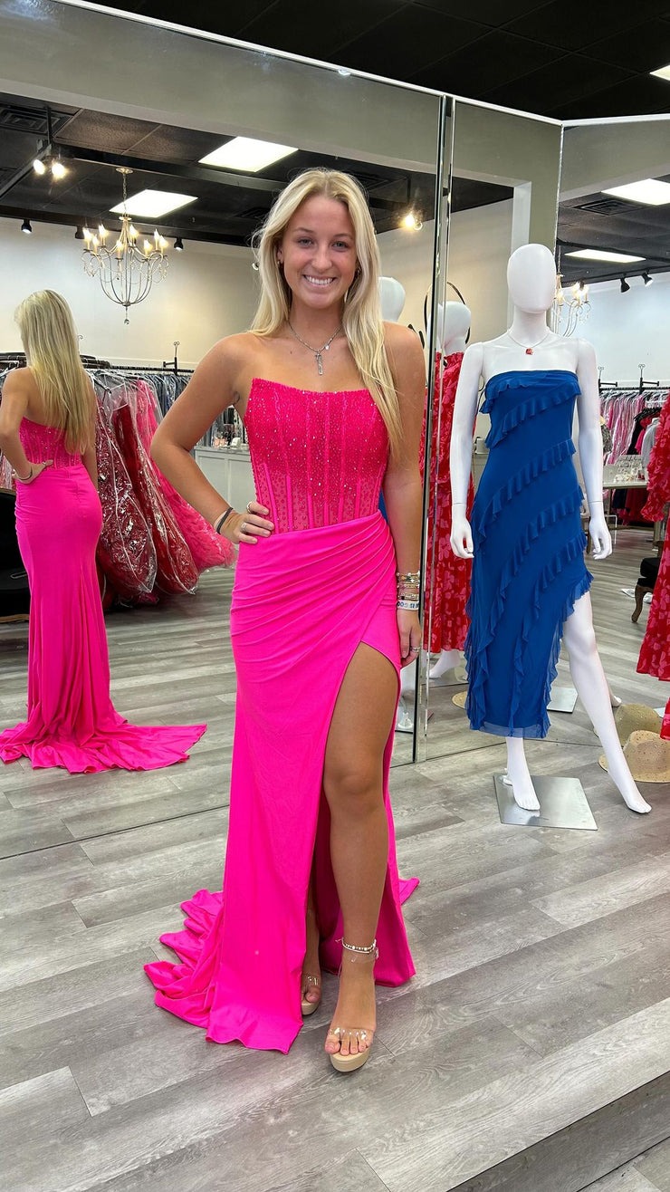 Charming Scoop Neck Hot Pink Satin Long Mermaid Prom Dresses with Beading,PD230867