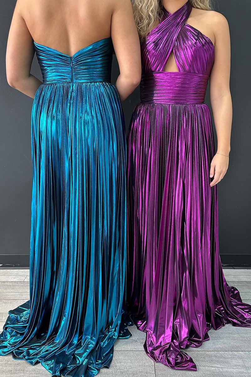 A-Line Purple Halter Pleated Satin Prom Dress with Slit ,PD230523