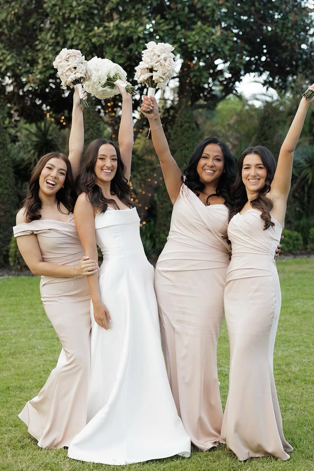 Elegant Off the Shoulder Blush Elastic Satin Long Mermaid Bridesmaid Dresses,PD230690