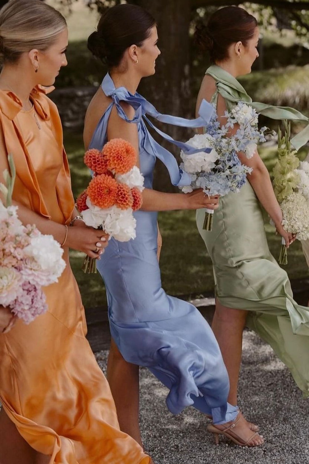Romantic Sheath Silk Satin Boat Neck Long Bridesmaid Dresses,PD230709