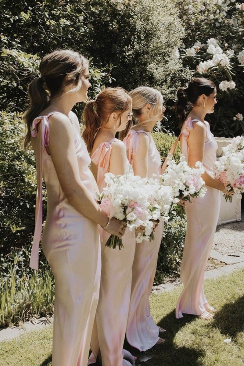 CutePink Satin Long Mermaid Bridesmaid Dresses with Bow ,PD230718