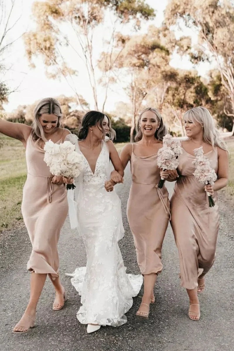 Champagne Sheath Cowl Neck Silk Satin Bridesmaid Dresses,PD230736
