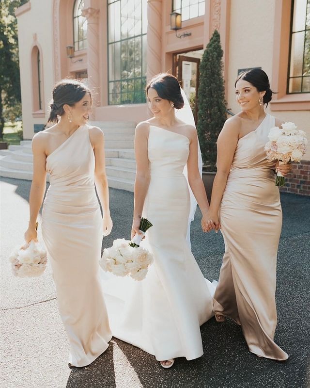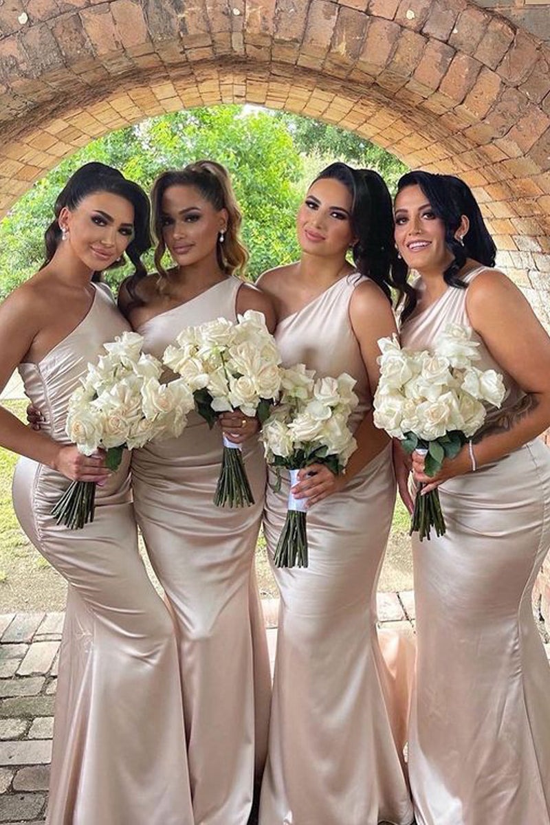 One Shoulder Champagne Satin Mermaid Bridesmaid Dresses,PD230737