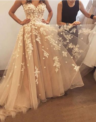 Champagne sweetheart neck tulle lace long prom dress, evening dress,PD1702713