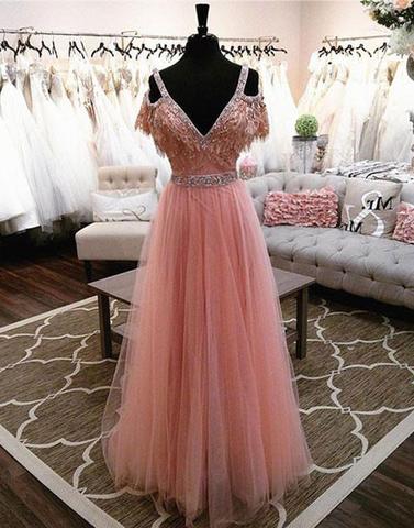 Pink v neck lace A line long prom dress, pink evening dress,PD171808