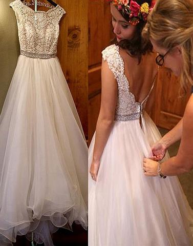 White lace tulle A lin long prom dress, white evening dress,PD171811