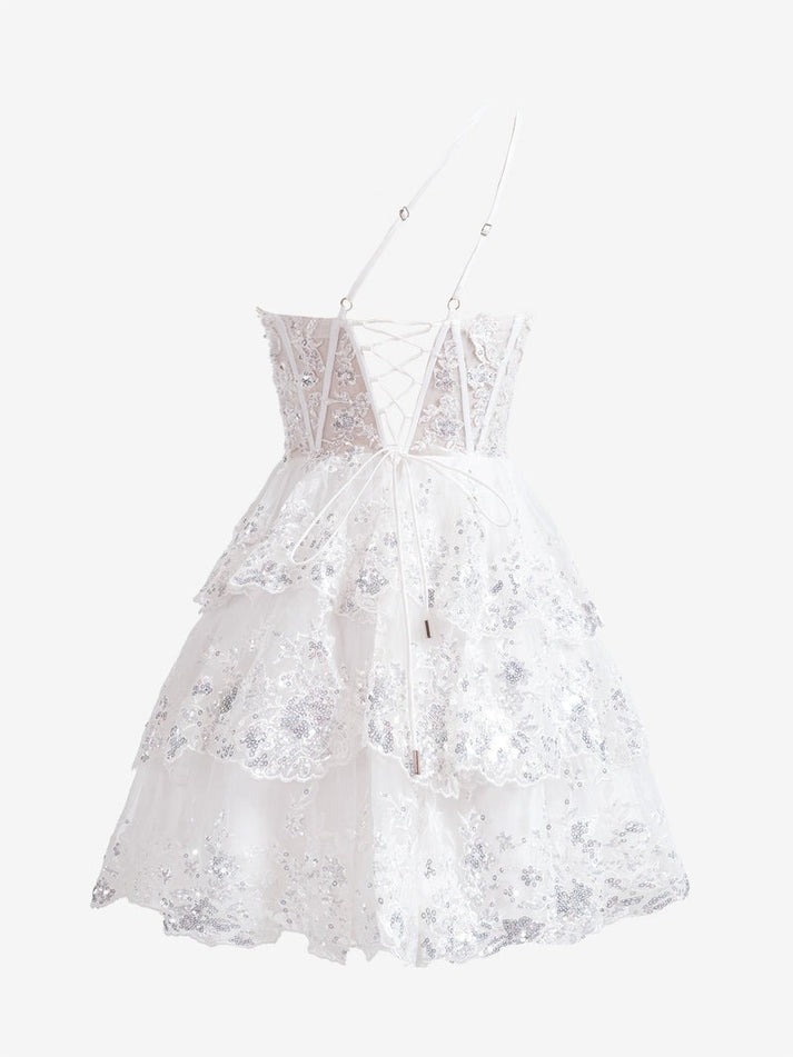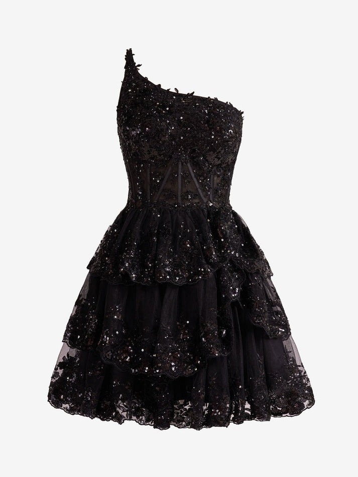 A Line One Shoulder Lace Navy Tiered Short Homecoming Dress, PD230139