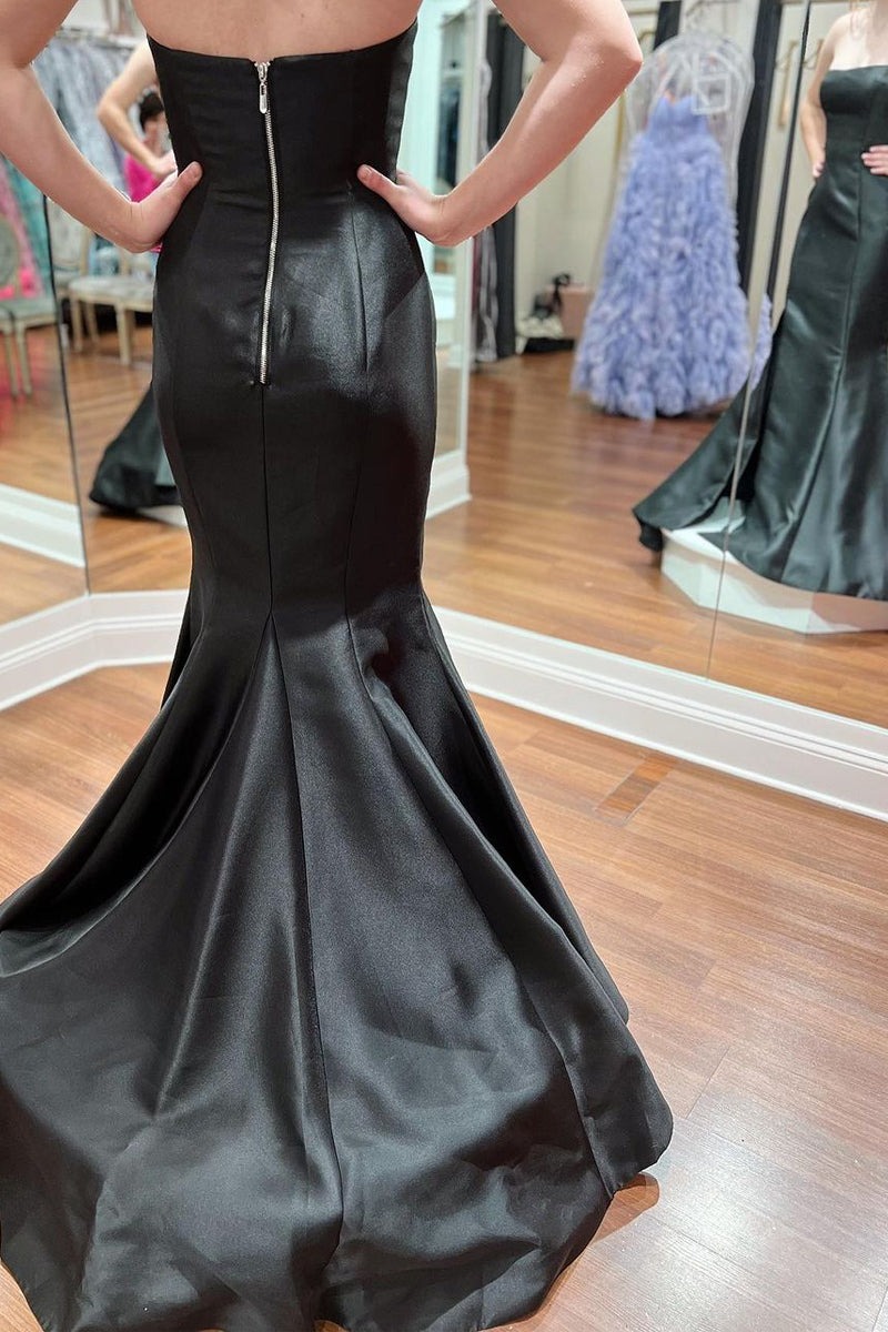 Mermaid Black Strapless Satin Prom Dress with Slit ,PD230524