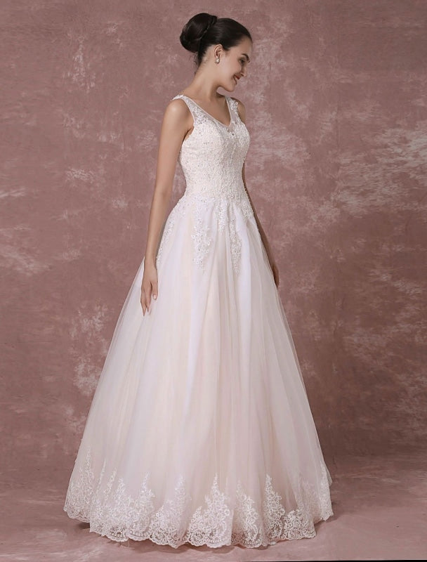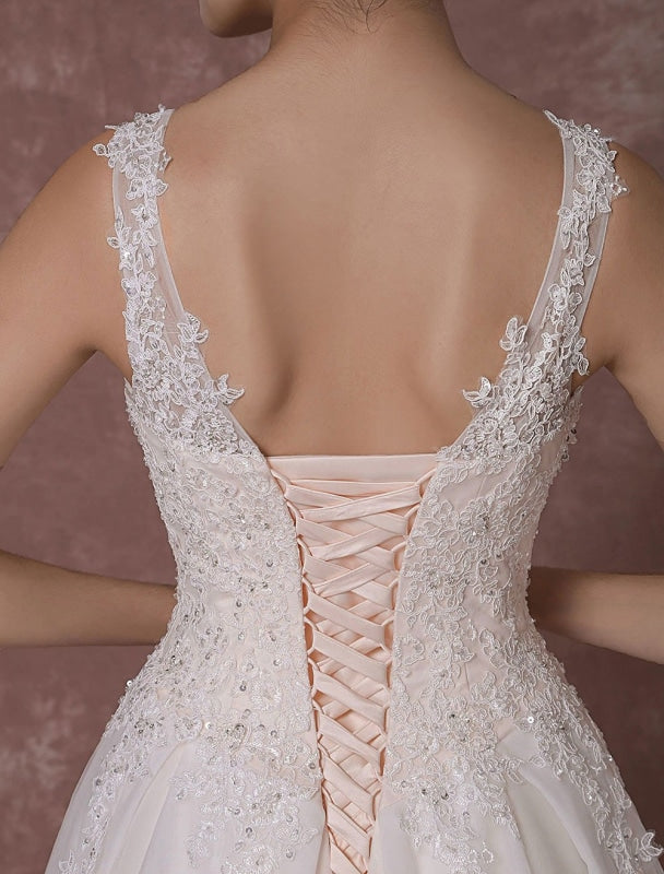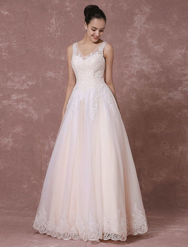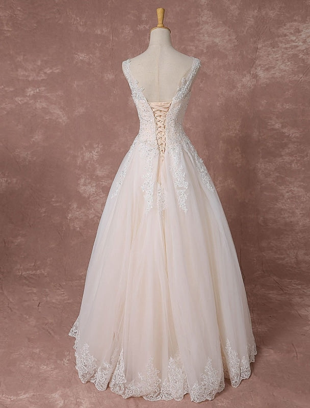 Champagne Lace Wedding Dress Backless Bridal Gown Floor-Length A-Line Beading Luxury Bridal Dress,PD22028