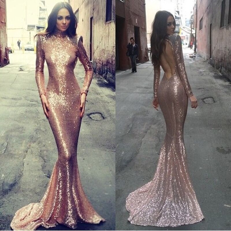Long sleeve mermaid prom dress, rose gold prom dresses, sequin prom dresses, backless prom dress, sexy prom dresses,160120002