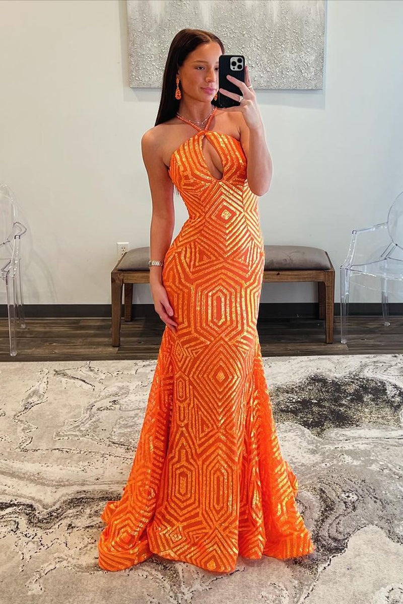 Mermaid Halter Keyhole Orange Sequins Long Prom Dresses ,PD230533