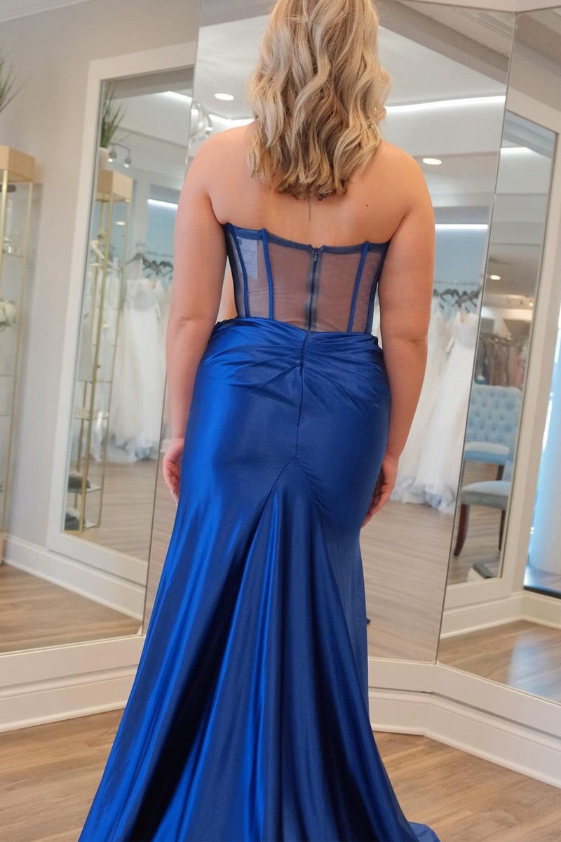 Strapless Navy Blue Satin Mermaid Long Prom Dresses ,PD230561