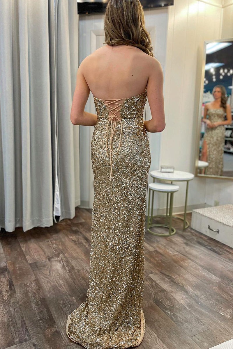 Gold Mermaid Strapless Sequins Prom Dresses with Slit,PD230589