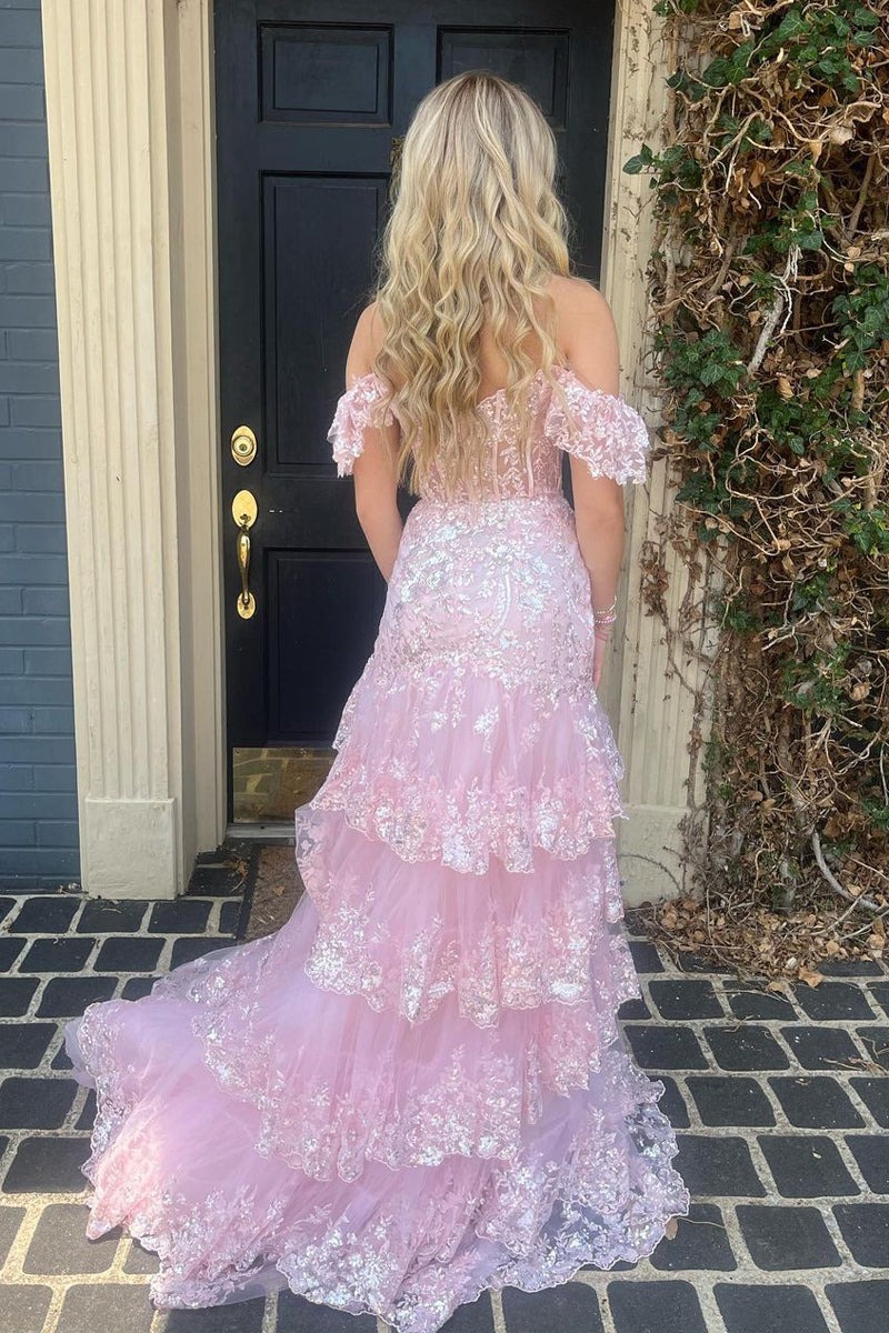 Pink Mermaid Off the Shoulder Tiered Sequin Tulle Long Prom Dresses,PD230602