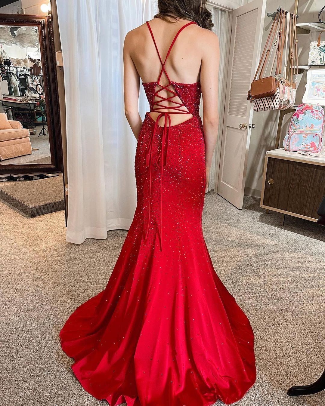 Charming V Neck Mermaid Red Satin Long Prom Dresses with Beading,evening Dress,PD230609