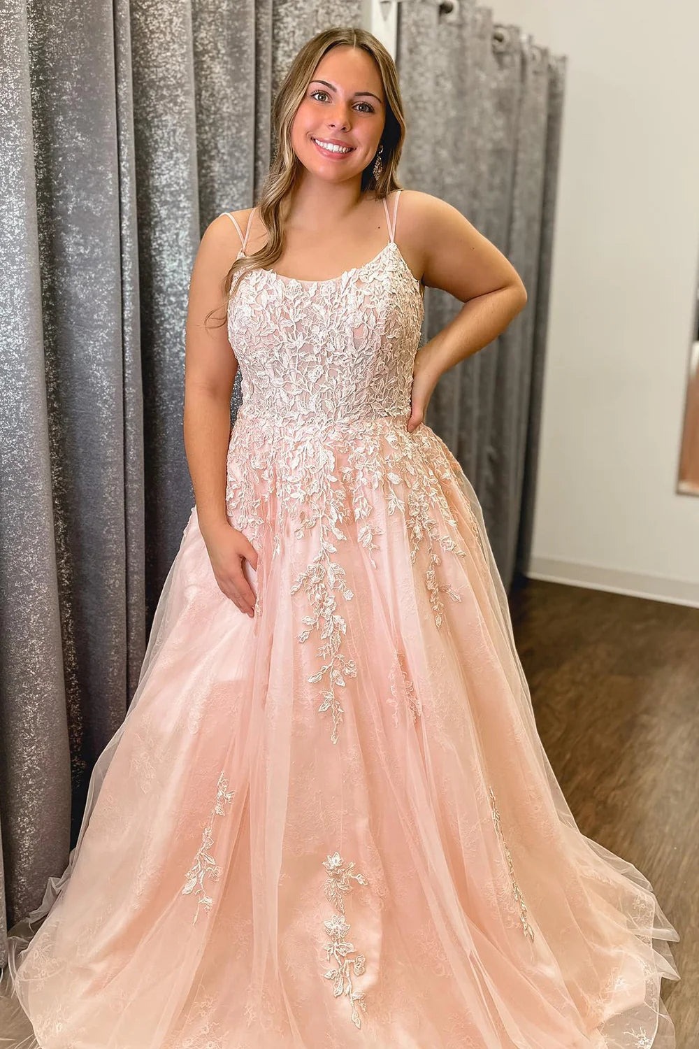Scoop Neck A-Line Blush Pink Tulle Long Prom Dresses with Appliques,evening Dress,PD230613