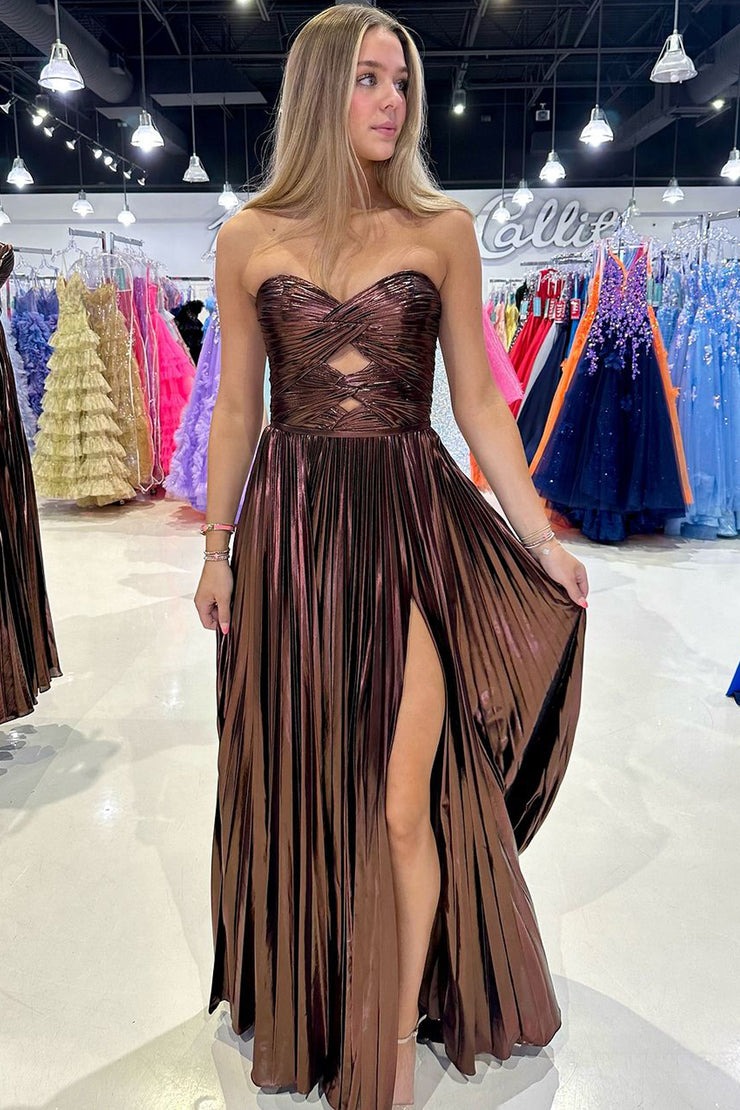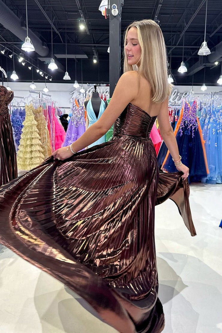 Charming Sweetheart Brown Sparkly Satin A Line Long Prom Dresses with Slit,PD230871