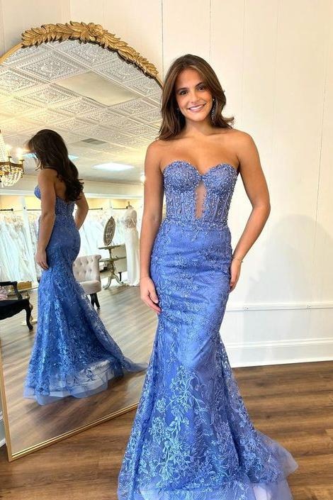 Sweetheart Strapless Blue Lace Long Mermaid Prom Dresses with Appliques ,PD230923