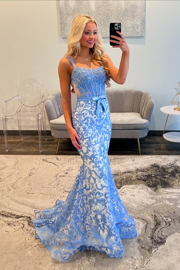 Gorgeous Scoop Neck Blue Lace Mermaid Prom Dress,PD230983