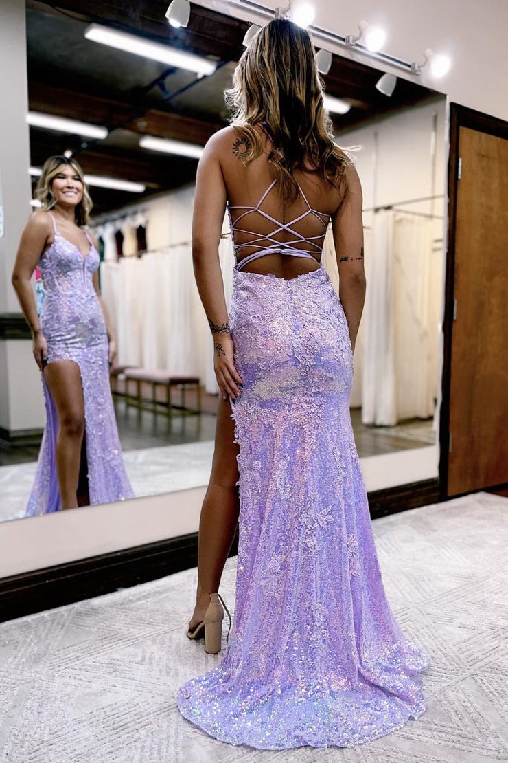 Cute V Neck Lavender Sequins Long Mermaid Prom Dress with Appliques,PD231046
