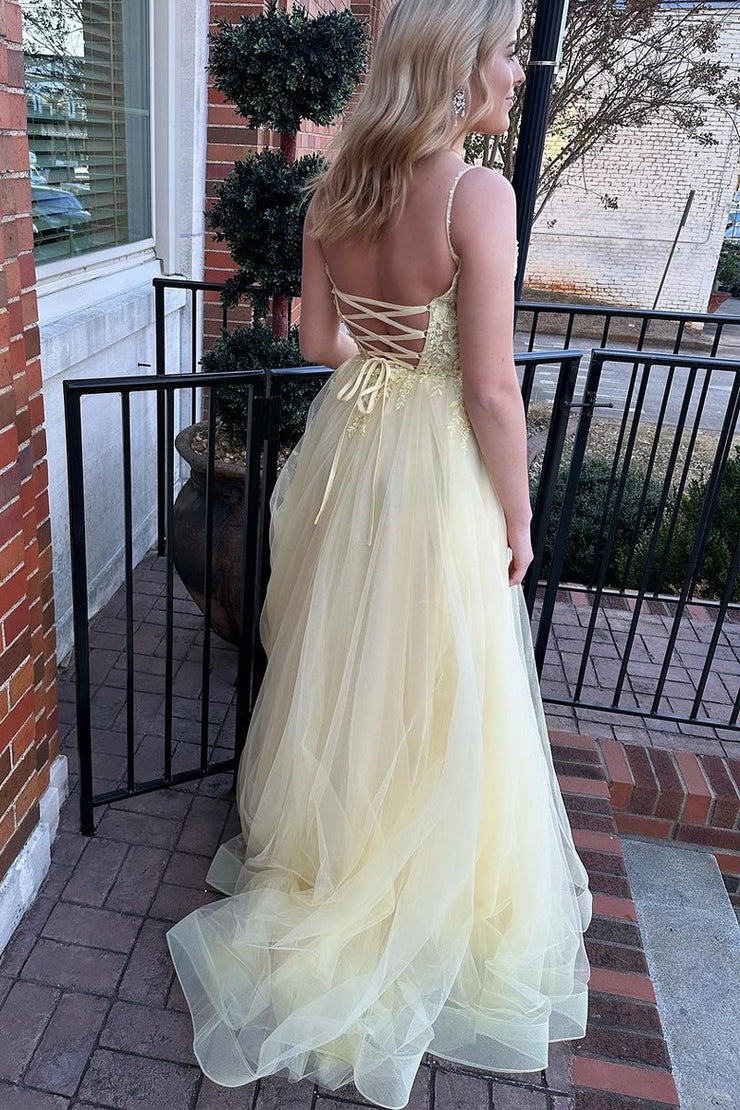 Cute V Neck Daffodil Tulle A Line Prom Dress with Appliques,PD231069