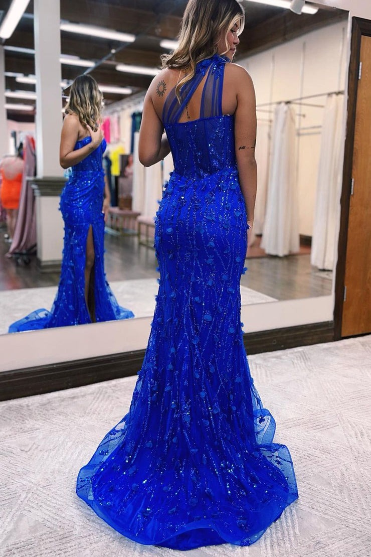 Charming One Shoulder Royal Blue Lace Mermaid Prom Dresses with Slit ,PD231142