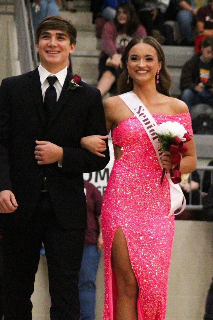 Charming One Shoulder Hot Pink Sequins Long Mermaid Prom Dresses with Slit ,PD231144