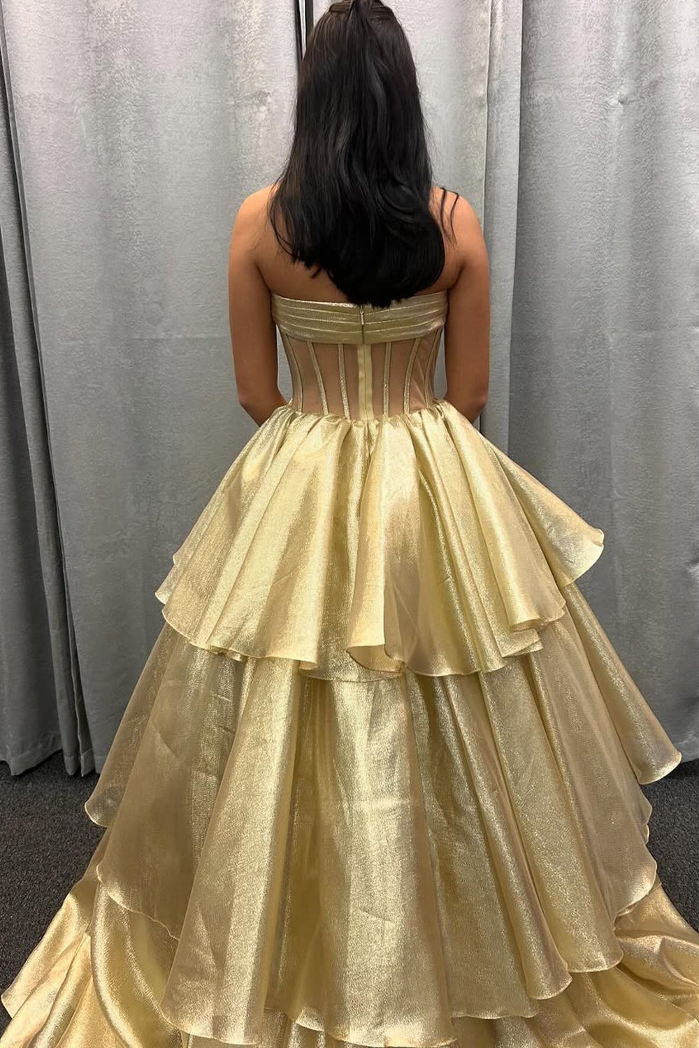 Ball Gown Gold Organza Tiered Strapless Prom Dresses with Bow,PD231165