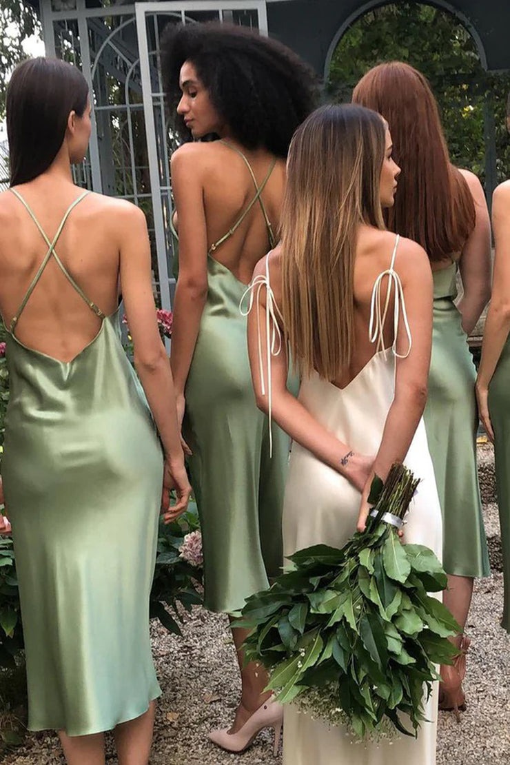 Charming Tea Length Sheath Cowl Neck Sage Green Silk Satin Bridesmaid Dresses ,PD231210