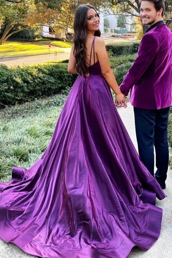A-line Purple Satin Backless Long Prom Dress With Slit ,PD231301