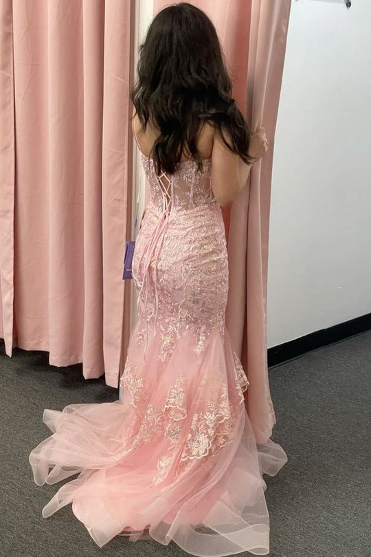 Mermaid Pink Spaghetti Straps Lace Appliques Long Prom Dress,PD231413