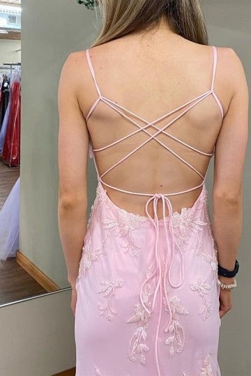 Spaghetti Straps Pink V-Neck Appliques Sleeveless Prom Dress,PD231422